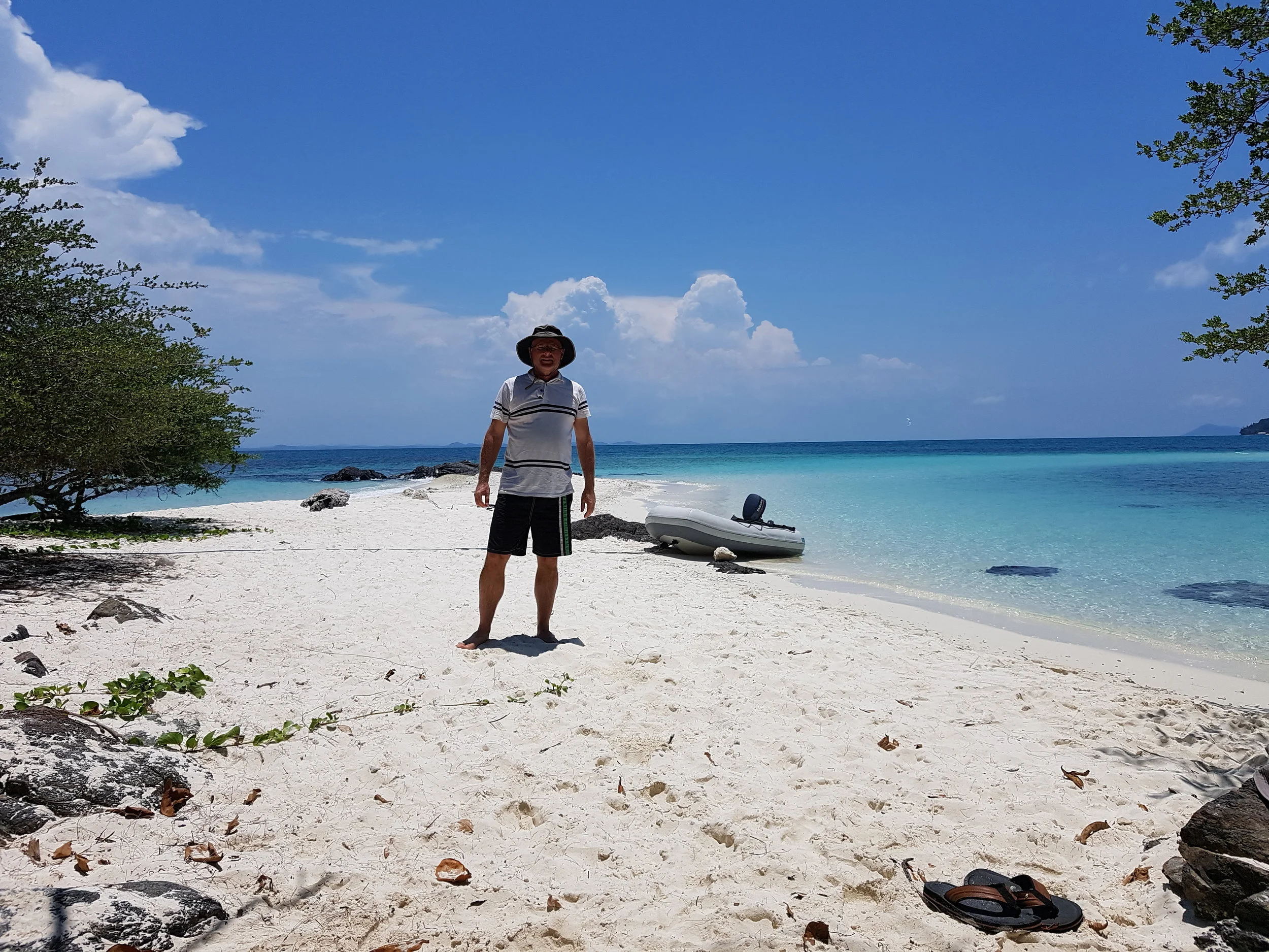Anchoring at Pulau Besar, of the coast of Malacca. This island is a pilgrimage site for Muslims, mainly of Indian descent. It has 14 tombs with the remains of the family of Sultan Al Ariffin Syeikh Ismail, born in Baghdad in 1464 AD and 18th generation descendants of the Prophet Mohammed. Flower petals covered the tombs and I saw a pilgrim sprinkling water on one of the graves. Poor people, Malay and Indian-Malay, sleeping underneath tarps, in make-shift tents and small huts. I saw an old man with long grey scruffy beard washing himself at a fresh water well only 100 meters from the beach. Dare I say it: It all felt a bit mystical.