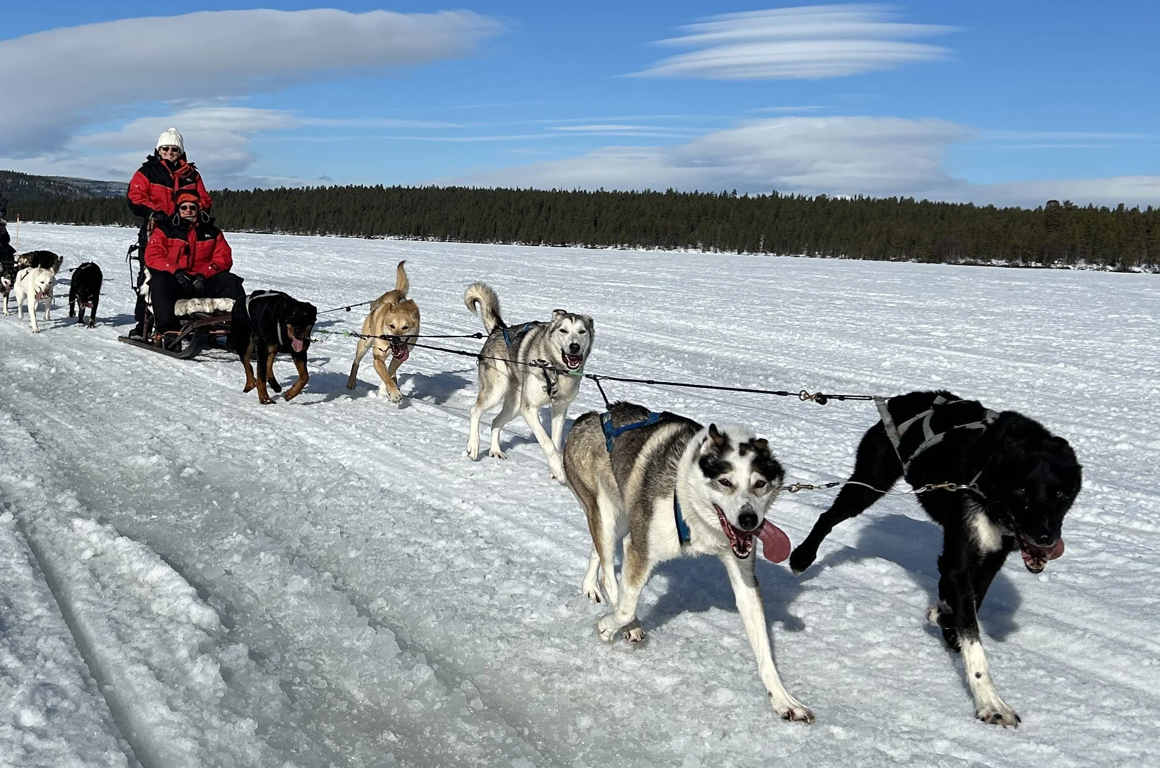 The stillness of strolling across the frozen Thon River contrasted to the adrenaline rush of driving a dog sled. Even before we saw the sleds, we heard 35 Alaskan huskies in an explosion of sound – high pitched yaps and deep howls. The dogs were not just excited; they were desperate to run. Francien and I swapped being the musher on our sled, standing with both feed on the brake to control the speed of the dogs. The moment we released the brake, the barking stopped and all we heard was the huff- huff- huff of our five dogs and the dry shush of the wooden runners. On the sled we travelled 20 km through tundra, boreal and birch forests. Crossing a frozen lake gave a sense of freedom and peacefulness. During a 30-minute Fika stop we played with the dogs, affectionate companions of the guides. Mushering Alaskan Huskies was an entirely new experience. It was amazing to see how five dogs pulled our sledge up a hill, across ice and fresh snow. We stopped three times to untangle one of the dogs. We left the sled with a face that felt wind burnt and glowing, the true sense of the far North.